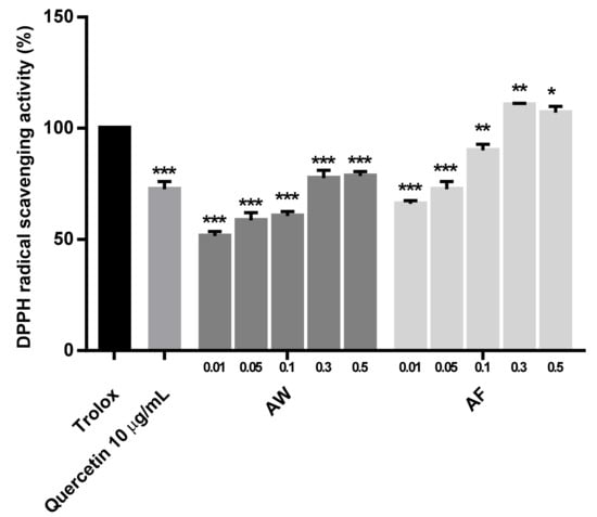DPPH free radical scavenging activities of various concentrations of two different extracts of Aloe vera leaf skin compared with 10 µg/mL quercetin and 0.05% Trolox as positive controls. AW: hot water extraction of Aloe vera leaf skin at 100 °C for 24 h. AF: L. plantarum fermentation of Aloe vera leaf skin at 37 °C for 3 days and extraction with an ultrasonicator at 40 kHz for 1 h at room temperature. The mean values ± SD for separate triplicate experiments are shown, and error bars indicate the SD. The significance of the difference was set to * p < 0.05, ** p < 0.01 and *** p < 0.001 compared with the Trolox group.