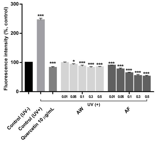 Intracellular ROS production in human fibroblasts was also measured using 2′,7′-dichlorofluorescein diacetate (H2-DCF-DA) as described below []: First, CCD-986sk cells were dispensed in a 48-well plate at a density of 4.0 × 104 cells/well, and cultured for 24 h with DMEM supplemented with 10% FBS at 37 °C. Thereafter, the culture medium in each well was replaced with a thin layer of phosphate-buffered saline (PBS) (pH 7.4) (Sigma, St. Louis, MO, USA), and the cells were exposed to UVb at a wavelength of 312 nm and an intensity of 80 mJ/cm2 using an ultraviolet lamp (model VL-6 M, Vilber Lourmat, Marine, France) for 120 s at room temperature. Then, 100 μL of various concentrations of the 2 samples, AW and AF, and 10 μg/mL quercetin as a positive control were added to the wells and further cultured for 24 h. Subsequently, the cells were washed with PBS and treated with 10 μM DCF-DA in Hank’s balanced salt solution in a dark room for 30 min. The cells were washed with PBS, suspended in 1% Triton X-100, and the absorbance was measured using a fluorescence spectrophotometer (UTX-20M, Biostep Co., Burkhardsdorf, Germany) at an excitation wavelength of 490 nm and an emission wavelength of 525 nm.