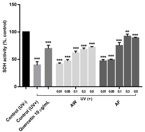 The protective effect on mitochondria was measured as the ratio of SDH activities in UVb-irradiated human skin fibroblasts treated with various concentrations of the samples up to 25 mU/mg to the SDH activities in the control cells (not treated with UVb light) (data not shown). In Figure 6, all three samples, quercetin, the AE, and the AF, clearly restored SDH activity in UVb-irradiated skin cells up to 89.30 ± 1.14% of the control after treatment with 0.5% of the AF, the highest concentration, and similar results were obtained from cells treated with 0.3% of the AF. Specifically, 10 μg/mL quercetin maintained SDH activity at 69.55 ± 6.33% in the mitochondria of UVb-irradiated human fibroblasts, while SDH activities were substantially reduced to 39.06 ± 3.68% in cells that were only exposed to UVb light without treatment with the samples. This result was also supported by the recent work that flavonoids have their cytoprotective effects on mitochondrial pathways []; especially, quercetin showed the inhibition of oxidative stress by directly scavenging ROS []. However, in cells treated with 0.3% AW and the AF, SDH enzyme activities were not substantially reduced, and the values were only 68.15 ± 2.88% and 92.30 ± 4.61% of the control, respectively. Interestingly, a less than 20% decrease in SDH activity was observed in adding 0.3% of the AF, which were much better than those obtained with quercetin and AW. These results clearly proved that AF exerts a fairly strong effect on protecting against mitochondrial damage by restoring complex II activity in mitochondrial electron transport pathways since SDH is a key enzyme in the respiratory complex of mitochondria []. Therefore, the results of Figure 3, Figure 5 and Figure 6 imply that AF delays/inhibits the skin aging process because complex II was most closely correlated with skin cell aging []. However, a more detailed correlation with the activation of mitochondrial function should be explained by considering multi-functional mitochondrial protein such as voltage-dependent anion channel (VDAC) after treating the samples [].