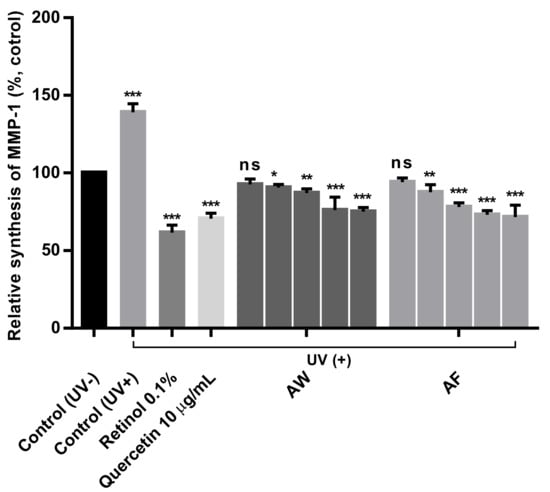 The inhibition of MMP-1 synthesis in UVb-irradiated human skin fibroblasts treated with 10 µg/mL quercetin and various concentrations of the two different extracts. AW: hot water extraction of Aloe vera leaf skin at 100 °C for 24 h. AF: L. plantarum fermentation of Aloe vera leaf skin at 37 °C for 3 days and extraction with an ultrasonicator at 40 kHz for 1 h at room temperature. The mean values ± SD for separate triplicate experiments are shown, and error bars indicate the SD. The significance of the difference was set to * p < 0.05, ** p < 0.01 and *** p < 0.001 compared with the control group.