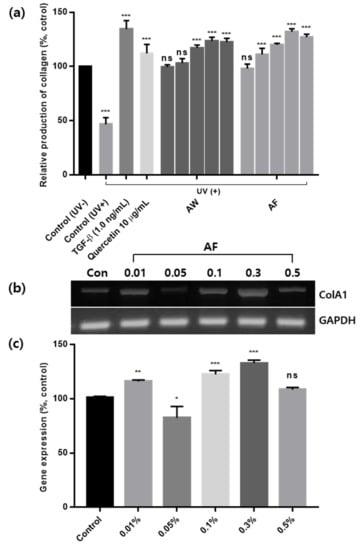Therefore, Figure 7 and Figure 8 show the inhibition of MMP-1 and the production of collagen along with the regulation of gene expression in UVb-irradiated human skin fibroblasts. The production of MMP-1, which is also an indicator of skin wrinkling processes, was observed to more clearly prove that the AF is involved in the skin antiaging process, as shown in Figure 7. In Figure 7, after irradiation with UVb light, MMP-1 levels were substantially increased up to 143% of the control cells (not exposed to UVb light) in which 125 ng/mL MMP-1 was produced (data not shown), while MMP-1 levels were decreased to 70.57 ± 3.49% in UVb-irradiated cells with 10 μg/mL quercetin. Treatments with 0.3% and 0.5% of the AW also resulted in a 75% reduction in MMP-1 production. Compared to those results, the AF significantly reduced MMP-1 production down to 69.41 ± 2.63% at a dose of 0.3% without a further decrease in the presence of 0.5% of the AF. As shown in Figure 8a, skin fibroblast cells with mitochondrial damage induced by UVb light exhibited significantly reduced collagen production down to 45% of the 45 ng/mL collagen produced by the control cells (data not shown). Quercetin alone enhanced the restoration of collagen production, up to 112.37 ± 8.01% of the control, after treatment with 10 µg/mL quercetin, and the addition of 0.3% of the AW induced a restoration effect similar to that of quercetin itself. Moreover, a 125 ± 5.45% increase in collagen production was measured after treatment with 0.3% of the AF. Compared to the control, a value was much higher than that induced by quercetin itself with the same contents in the AF. This result clearly implies a synergistic effect of quercetin and other biological components in the AF. A similar restoration of collagen production was also observed in cells treated with 0.3% and 0.5% of the AW and AF. Thus, a saturation concentration may exist after which the extracts are no longer more effective at certain dosages, which in this case was 0.5%. However, the AF has the ability to prevent skin wrinkling processes, specifically in skin photo-aging, possibly by reversing mitochondrial dysfunction. The expression levels of the genes related to collagen production are also shown in Figure 8b,c. As shown in Figure 8b, the expression of collagen genes was substantially upregulated in UVb-irradiated cells treated with 0.3% of the AF as the concentration dependency manner (ColA1). Its band intensity was also digitized in Figure 8c for easy comparison with other bands, showing that all of the results were similar patterns to those presented in Figure 8b. Overall speaking, the protective effects of the AF on skin wrinkling appear to be similar to or even better than those of other plant extracts, such as Emblica officinalis or alpha-naphthoflavone, etc. [,]. However, these reports did not show and/or correlate changes in the production of collagen and the inhibition of MMP-1 with the effects on reversing mitochondrial dysfunction. Compared to those reports, the results of the present study clearly showed that the AF increased collagen production by restoring mitochondrial activities, although the mitochondria of human skin fibroblast cells were damaged by UVb light. Therefore, these results indicate that the AF must play an important role in preventing the skin aging process by effectively increasing collagen production and inhibiting MMP-1 production in the presence of exogenous aging factors, such as UVb light. The efficacy of AF was better than that of AW and even much better than quercetin itself, implying that the effects of AF are due to the synergistic effects of quercetin and other bioactive substances produced during lactic acid bacterial fermentation. The results of this study were also supported by other reports showing that plant phenolic compounds possess significant potential to inhibit or even reverse signs of aging, such as wrinkles or hyperpigmentation marks [].
