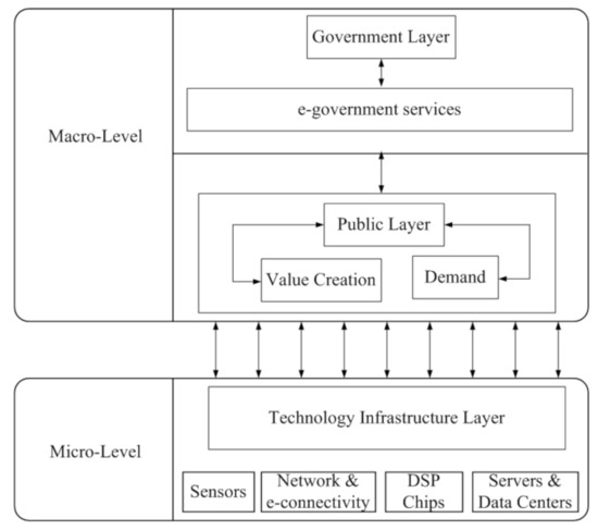 The overall framework can be squeezed into the macro-level and micro-level as depicted in Figure 1. The technology infrastructure level is referred to as the micro-level; this is because micro processing of data as well as sensor interfacing, and network computing are done in this layer. The macro-level concentrates more on public services that are related to creating value and demand for the citizens and this layer is referred to as the government layer [1]. This work emphasizes the micro-level framework only.
