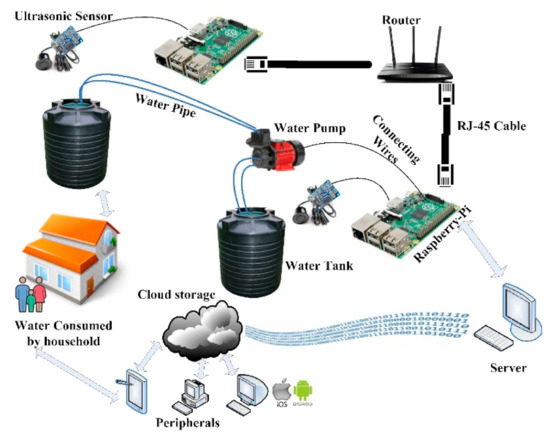 The research work used one full-on experiment to develop an automatic system to fill and store the water in a home using ultrasound technology as shown in Figure 3. This experiment uses two cylindrical water tanks. The local area network (LAN) cat6 cable has been used for communication between upper and lower tanks. Raspberry-Pi is used for networking and controlling the sensors. Trial versions of cloud computing have been utilized to store the data in the cloud. Two ultrasonic sensors are used, one in the bottom tank and the other in the upper one. The storage tank is in the lower position and from this tank the daily usage of water in the home takes place. A comparison is made between the levels of water between these two tanks to automatically switch on the motor. Ultrasonic Sensor1 and sensor2 used in the bottom tank and upper tank considers the mathematical relations that are based on Doppler’s effect.
