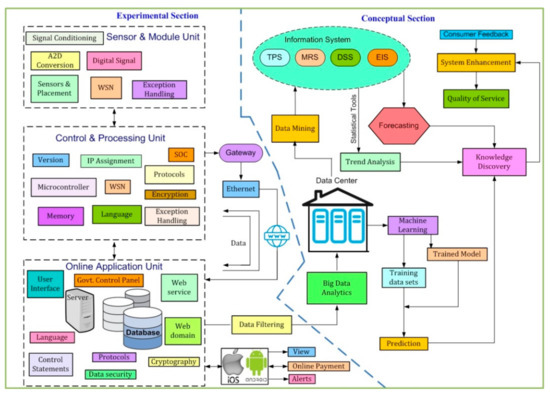 The experimental section as a whole in Figure 4 is realized by using full-on experiment as shown in Figure 3. The conceptual section of the developed IoT framework cannot be realized until and unless the devices are used in full-fledged manner either within a municipality, state or the entire country. The experimental section of the framework concentrated more on generating the real-time data. The conceptual section deals more with the management and efficient usage of the data. The voluminous data are generated from the experimental section at a high velocity, therefore big data analytics is very essential and servers like Amazon S3 (simple storage service) can be taken into consideration. The management of the data can also be undertaken by establishing own data center. After the data sets are obtained, the system can be trained to obtain the future values regarding demand and the supply of water. This can be one approach, another approach can be processing the data in an information system after the data mining and applying the statistical measures to perform trend analysis, and the information system itself can also forecast the amount of water needed for future. All of these operations come down to discovering knowledge from different viewpoints. This information along with consumer feedback can help to enhance the existing system to a great extent and this is a never ending process.