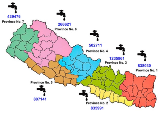 - Udmale, P.; Ishidaira, H.; Thapa, B.R.; Shakya, N.M. The Status of Domestic Water Demand: Supply Deficit in the Kathmandu Valley, Nepal. Communication 2016, 8, 196. [Google Scholar] [CrossRef]