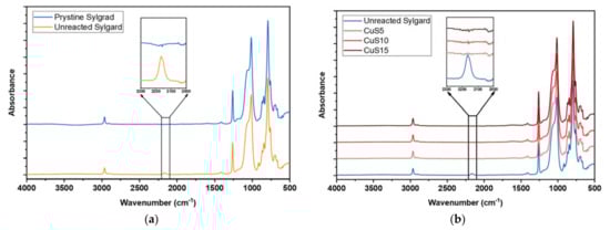 ATR-FTIR analysis was performed to evaluate curing of the composite samples. The spectrum of uncured Sylgard + curing agent showed a characteristic peak at 2160 cm−1, which is attributable to the stretching vibration of Si-H groups, related to the curing agent [,]. Figure 1 shows the pristine Sylgard (Figure 1a) and the formulation CuS5 (Figure 1b) as an example of filled formulation, before and after the thermal treatment. In all the cured formulations, the peak at 2160 cm−1 completely disappeared after thermal treatment, confirming that the proposed thermal curing process (150 °C, 60 min) fulfilled the cross-linking of the elastomeric matrix despite the presence of fillers (all the ATR-FTIR analysis are reported in the Supplementary Materials Figures S1–S5).