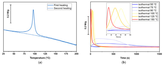 DSC thermogram; (a) thermogram curve for the pristine Sylgard, first heating ramp with curing peak at 96 °C (blue continuous curve) and second heating curve (blue dot curve); (b) thermogram in isothermal mode for Sylgard at different temperatures.