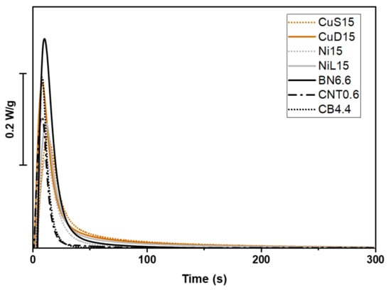 DSC thermogram of isothermal curing at 150 °C for the tested formulations.