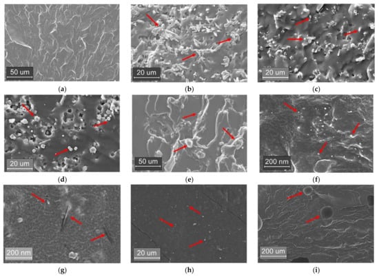 SEM imagines for composite, the red arrows highlight the filler and in the picture I the voids; (a) pristine Sylgard, 100×; (b) Cu15D, 400×; (c) Cu15S, 4000×; (d) Ni15, 400×; (e) NiL15, 100×; (f) BN6.6, 10,000×; (g) CNT0.6, 10,000×; (h) CB4.4, 400×; (i) CB4.4 100×.