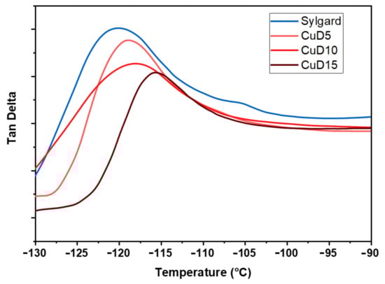 The effect of the dispersed fillers on the thermo-mechanical properties of crosslinked silicone composites was evaluated by DMTA. As reported in Table 2, the addition of the filler did not significantly influence the Tg of the crosslinked polymer matrix. Indeed, all the measured Tg lay within −125 °C and −115 °C. Figure 5 shows, as an example, the tanδ curves for the Sylgard containing spheroidal copper (all results are reported in Supplementary Materials Figures S6–S11). The increased Tg can be explained by the hindrance effect of the filler to the motion of PDSM chains. This result was in accordance with some previous researches [,,].