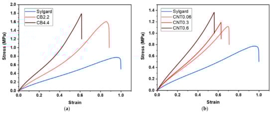 Tensile test results; (a) stress-strain curves for Sylgard composites containing CB; (b) stress-strain curves for Sylgard composites containing CNTs.