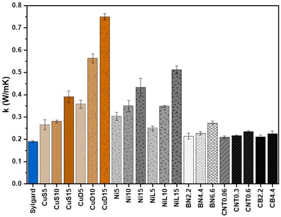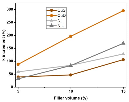 Similarly, the Ni particles dispersion within the polymeric matrix showed an enhancement of the k value, achieving higher values by using larger particles (see data collected in Figure 7 and Figure 8) at a content of 15 vol% with a successful enhancement of k of around 150%. These results are in agreement with the data reported in literature [,,], where larger particles are more likely to produce a heat-conductive path in the materials with a higher enhance the thermal conductivity.