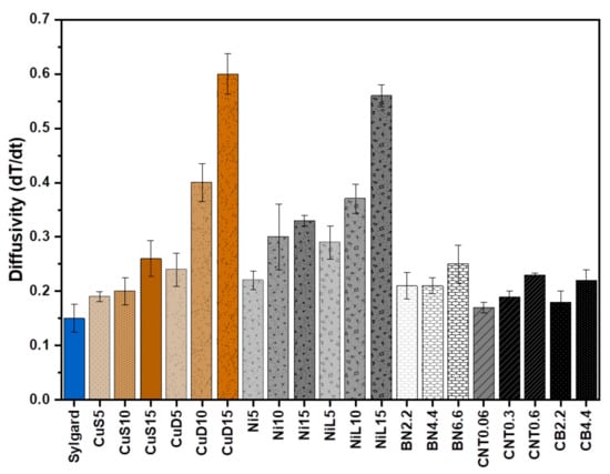 The thermal diffusivity values (α) are directly connected to thermal conductivity (k), and the data for all investigated composites are collected in Figure 9. It is evident a thermal diffusivity enhancement for all the investigated fillers, and in agreement with the results of thermal conductivity, the size and shape of the fillers can strongly influence heat dispersion throughout the composite.