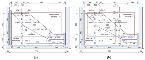 When preparing the upper layer of the slope models, the deposit materials were compacted after placement in the model box using the controlled-volume method [42] to a dry density of 1.81 g/cm3. After the placement of each layer, the deposit surface was smoothed with a soft brush and instruments were placed in their specific positions. Silicone oil was smeared over the sides of the rigid box to provide a lower friction coefficient at the interface with the walls.