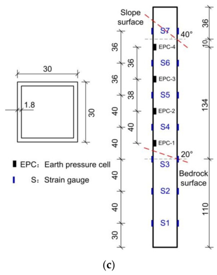 Pile bending moments were measured by seven pairs of strain gauges in a full bridge configuration mounted on the tube surface (Figure 1c); lateral pile–soil pressures were measured by four miniature transducers embedded in the pile. The pile strain gauges and miniature earth pressure transducers were calibrated before installation. After calibration and verification that all sensors were working, the model piles were embedded in the bedrock.
