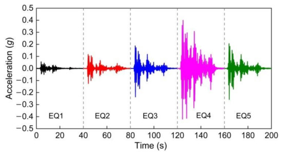 The dynamic input was provided by the shaking table in the centrifuge. Multiple shaking events (El Centro motion) covering a wide range of peak ground accelerations(PGA) were applied to both the 1# and 2# models while in flight. The shaking was applied parallel to the long sides of the model container and orthogonal to the pile row. The peak values of the horizontal input acceleration in the shaking events were adjusted to nearly 0.05 g, 0.10 g, 0.20 g, 0.40 g, and 0.20 g at the prototype scale (corresponding to 2.5 g, 5.0 g, 1.0 g, 2.0 g, and 1.0 g at the model scale), which corresponded to seismic intensities of 6°, 7°, 8°, 9°, and 8° based on the “Code for Seismic Design of Buildings” in China (GB 50011-2010) [43]. The time histories of input motions in instrument BA-0 are shown in Figure 2.
