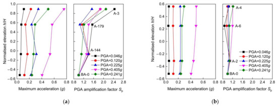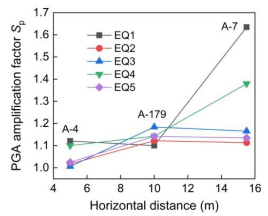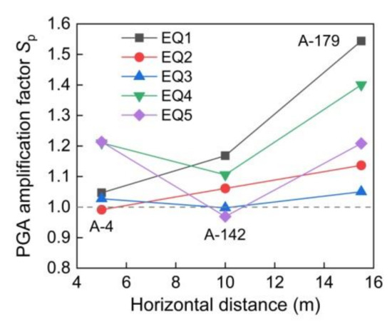 Moreover, at the same elevation on the slope, the PGA amplification factor of the deposit surface is greater than that of the bedrock surface, as shown in Figure 3a (BA-0,A-144 and A-179), and in Figure 3b (BA-0,A-2,A-6 and A-4). For example, at the height of 15.8 m (A-4, A-142 and A-179), the horizontal acceleration amplification factor distribution from the inside of the slope to the surface of the slope is illustrated in Figure 4. The mean average acceleration amplification factors from within to the surface are 1.10, 1.06, and 1.27, respectively. The difference in the PGA amplification factors between deposit surface and bedrock surface suggests typical surface amplification.