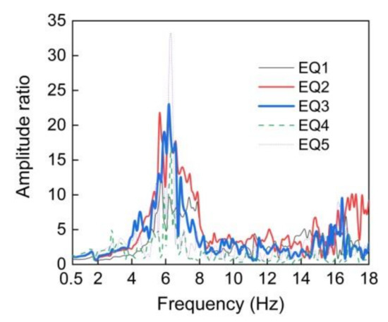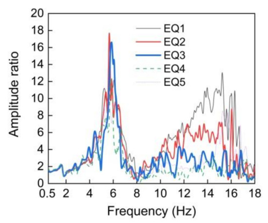 Figure 13 shows the amplitude ratios of the transfer function of the acceleration measured at A-1079 (pile top) and A-0 (bottom of the model box) in the 2# model during centrifuge testing. Its distribution is similar to that in Figure 8. The difference is that the amplification factor of frequency components from 5 to 7 Hz at the top of the stabilizing piles is greater than that at the crest of the slope in the 2# model.