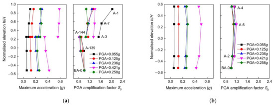 The PGA amplification factor Sp is defined as the peak acceleration at a given depth normalized to the peak acceleration of the input motion in the centrifuge tests as a function of normalized elevation (h/H).