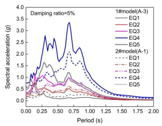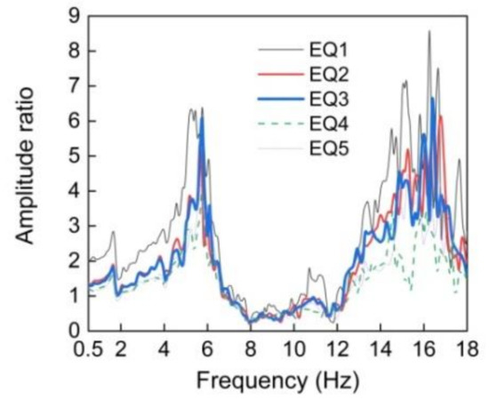 Figure 8 shows the amplitude ratios of the transfer function of the acceleration measured at A-1(slope crest) and A-0 (bottom of the model box) in the 2#model during centrifuge testing. In addition to the frequency components at 5 to 7 Hz, the frequency components at 15 to 17 Hz are also significantly amplified as the seismic wave propagates from the bottom to the crest, and the amplification is even greater than that of components at 5 to 7 Hz.