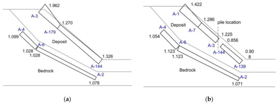 From Figure 9a, the mean average acceleration amplification factor in the upper part of the slope (A-179) is 1.326, which is greater than the magnification (A-4) at the same elevation within the slope (only slightly greater than 1); therefore, the different behaviors of the exterior and the interior of the slope will induce non-uniform movement. Qualitatively, the seismic waves transmitted from the bottom to the top create superimposed reflection and interference effects on the superficial layer, resulting in an acceleration amplification effect in the slope surface. Comparing Figure 9a with Figure 9b, it can be found that after the stabilizing piles are installed, the acceleration amplification factor near the slope surface is reduced compared with that beforehand. Stabilizing piles bridge the difference of acceleration response between the bedrock and deposit. The reason for the surface amplification effect can be explained as follows: part of the seismic energy is dissipated by damping during the propagation of seismic waves in the rock and soil mass, while the remaining energy is manifest as the seismic response of the rock and soil mass. The bedrock of the slope is harder than the upper part, so more energy is dissipated therein, and the dynamic response is smaller, while the surface soil mass of the slope is loose, and the dynamic response is greater [1,6]. The inconsistency in the acceleration (velocity or displacement) will lead to an inconsistency in the movement between the deposit layer and the bedrock layer. The uncoordinated movement between the shallow soil and the rock in the slope produces stripping tensile stress, and finally leads to the formation of a shallow surface landslide.