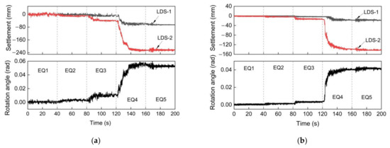 The permanent crest settlements in each shaking event were monitored by laser displacement transducers LDS-1 and LDS-2 (Figure 1). The time-history curves of the slope crest settlements of each shaking event in the 1# and 2# models are shown in Figure 11.