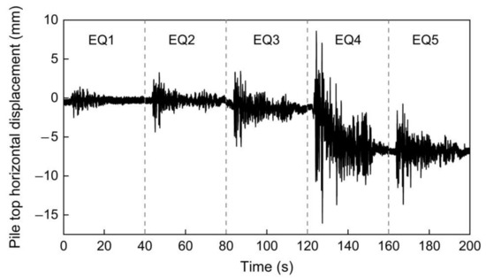 Figure 12 shows the time–history curve of the pile top horizontal displacement measured by laser displacement transducer LDS-3 in the centrifuge shaking table model test. The trend in pile top horizontal displacements in Figure 12 is akin to that in Figure 11: under a small input ground motion (EQ1, EQ2), there is almost no residual horizontal displacement at the pile top. In shaking event EQ3 (PGA = 0.236 g), the residual horizontal displacement of the pile top begins to occur, indicating that the stabilizing piles begin to be pushed, so that the pile top starts to undergo horizontal residual deformation. Under the excitation of a strong earthquake (EQ4, PGA = 0.421 g), the pile top undergoes a significant horizontal displacement, in which the maximum instantaneous horizontal displacement reaches 15.8 mm and the residual horizontal displacement of the pile top is 6.7 mm. This shows that the overlying deposits have a sliding, downwards trend, and the stabilizing piles have begun to bend significantly. From EQ4 to EQ5, the incremental residual horizontal displacement of the pile top is minimal, suggesting that the previous vibration has enhanced the seismic resistance of the slope to some extent when the slope is subjected to a strong excitation first and then excited by a smaller earthquake.