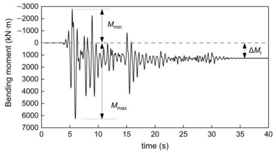 The typical response time–history curve of bending moments in the centrifuge model test (EQ4, S3) is shown in Figure 14. The residual bending moment increment ΔMr in each shaking event is defined as the difference between the beginning and the end of the response time-history curve of the bending moment. During the seismic loading process, the maximum dynamic bending moment Mmax and the minimum dynamic bending moment Mmin in each shaking event are taken as the difference between the beginning and the peak and trough, respectively, of the time–history curve of the bending moment.