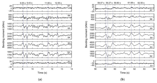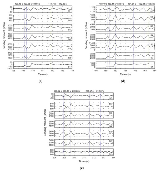 Figure 15 shows the time–history curves of bending moments measured by strain gauges on a stabilizing pile under five continuous earthquake excitations (only 6 s of the time–history are taken in each case to show the variation in the bending moment). It can be seen from Figure 15 that the bending moment measured at different points on the stabilizing piles does not reach the maximum value at the same time. Taking EQ3 as an example (Figure 15c), the times corresponding to the peak signal amplitude are 109.91 s, 109.91 s, 109.91 s, 109.92 s, 109.93 s, 109.95 s, and 110.03 s (S1–S7), and the corresponding times to the wave trough are 109.35 s, 109.35 s, 109.36 s, 109.37 s, 109.38 s, 109.37 s, and 109.48 s (S1–S7) at each strain gauge. It can be seen that the bending moment on the stabilizing piles embedded in the bedrock (S1, S2, and S3) exhibits no phase difference, while there is a phase difference in the bending moment on the pile above the bedrock (S4, S5, S6, and S7), especially near the top of the pile (S7) where the time difference is about 0.1 s. This is mainly due to the interaction between the stabilizing piles and the deposit, and the onset of the effect of viscous damping, which will be beneficial to the dissipation of earthquake energy.