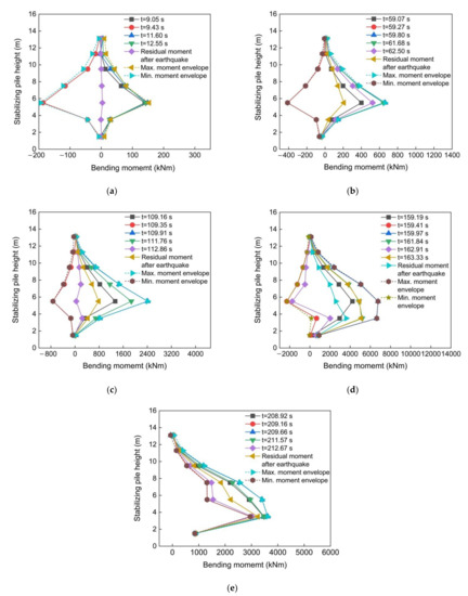 Maximum and minimum bending moment envelopes, residual bending moment after an earthquake, and the dynamic bending moment on a stabilizing pile: (a) EQ1; (b) EQ2; (c) EQ3; (d) EQ4; (e) EQ5.