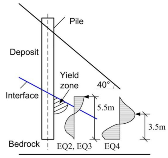 The increment indistributed load in EQ1 is almost zero, and in EQ5 it is equal to that in EQ4. It is noted that the distributed load increment generated by the seismic excitation in Figure 19 is negative near the slip surface, which indicates that the earth pressure in front of the pile is large. The sliding force generated by the seismic excitation is mainly concentrated in the part above 3.5 m up the slip surface. It can be calculated that the point of action of the resultant force is 7.46 m above the slip surface. The point of action of the resultant force is 1.54 m below the slope surface, which indicates that the earthquake mainly causes shallow sliding of the deposit, resulting in the distribution of the load increment in the upper part of the pile.