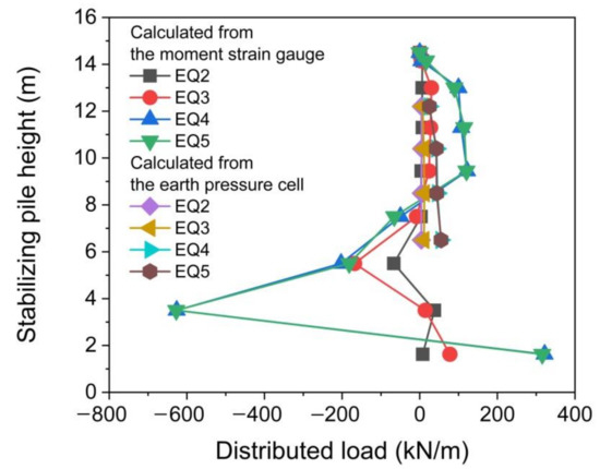 In the dynamic centripetal modeling tests, four earth pressure cells were placed on the stabilizing pile above the bedrock surface. In addition, according to the differential relationship between moment M, shear force Q, and distributed load q on the stabilizing pile (), the distributed load q on the stabilizing pile after each shaking event can be roughly obtained (, where is the distance between two adjacent moment gauges) from the residual moment diagram in Figure 16. The comparison of distributed load increment obtained by moment strain gauge and earth pressure cell (from pressure integral to distributed load) on a stabilizing pile after each shaking event is shown in Figure 18 (the increment of distributed load in EQ1 is almost zero, so is not shown in Figure 18 for clarity). It should be pointed out that the centrifuge model test gave values of pile–soil pressure on only one side surface of the pile, while the distributed load calculated from the bending moment is the pressure transmitted by the soil to the whole pile (four surfaces). There are differences between the two: Figure 18 shows that the distributions of the two are similar, but the values differ significantly when increasing the input PGA.