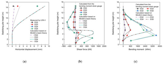 Comparison of the calculated results after test–measurement conversion and the calculated results based on Mindlin beam theory for a stabilizing pile after each shaking event: (a) horizontal displacement; (b) shear force; (c) bending moment.