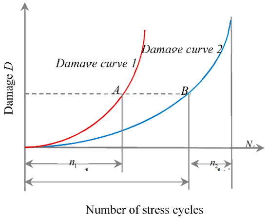 Based on Equation (2), it can be calculated that the damage corresponding to the stress level acting on is equivalent to the damage corresponding to the stress level acting on , which can be expressed as follows: