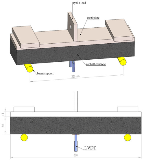 Schematic illustration of fatigue test for steel deck–asphalt pavement beam.