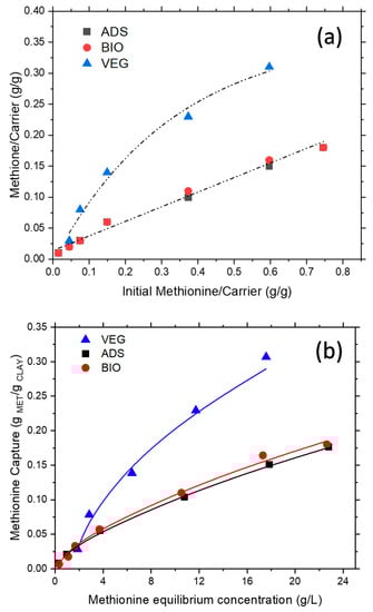 The effect of initial methionine content is reported in Figure 4a. It was evident that all the carriers were able to capture the target molecule; however, in different extents and, apparently, via different mechanisms. VEG was able to adsorb larger amounts of methionine, but, at higher methionine content, a plateau is reached. On the other side, ADS and BIO, which evidenced a fully overlapped linear behavior, were able to capture lower amounts of methionine, on average 1/3 of VEG, but no site saturation was apparently present. To deeper comprehend differences in the intercalation/adsorption characteristics and the occurring mechanisms when the different sorbents are used, adsorption isotherms measurements were analyzed. The methionine–clay interaction was interpreted according to both Langmuir and Freundlich models [24,25]. It is well known, indeed, that the Langmuir model describes a more homogeneous distribution of adsorption sites energy, where equal active sites can be occupied only once, while the Freundlich model is able to describe complex and heterogeneous surfaces.