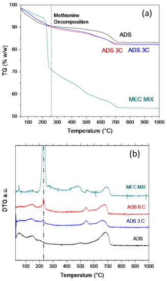 - A weight loss in the range 220–240 °C, always sharp and well defined, which is only present in the methionine-containing samples. This phenomenon is clearly associated with methionine decomposition, being centered at 250 °C, and corresponding to pure methionine degradation. The extent of the phenomenon increases on increasing methionine content (Figure 7b, compare ADS 3C and ADS 6C). Considering temperature and shape, this phenomenon corresponds to free and/or weakly bounded methionine. This attribution is also confirmed by DTG of the mechanical mixture (Figure 7b) (composition equal to ADS 6C), where no and/or very poor MET–ADS interaction closely resembles pure methionine decomposition peak (Figure 7c).