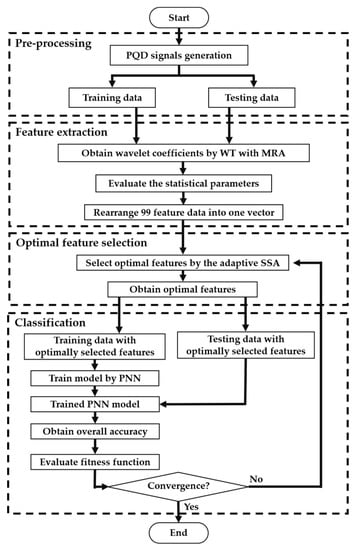 The rest of this paper is arranged as follows: A synthesis of power quality signals using mathematic equations under specific constraints is shown in Section 2. Section 3 describes the feature extraction process, while Section 4 explains the classifier based on a probabilistic neural network. Section 5 expresses the mechanism of the adaptive SSA as optimal feature selection. Then, Section 6 shows the simulation results including the related discussions. Finally, the results are concluded in Section 7.