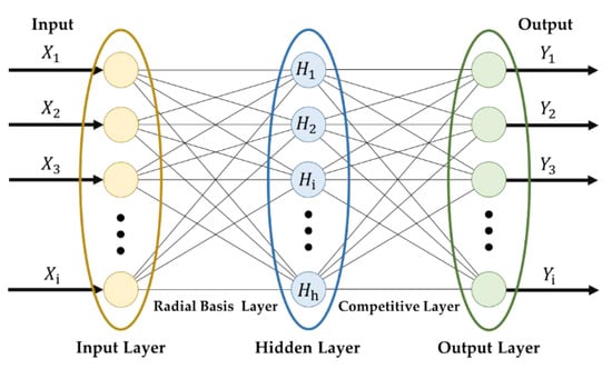 In the PQD classification, the classifier is a process that classifies the power quality signal type. From the literature, many approaches have been performed as the classifier in power quality classification research [,,]. PNN, which is one type of ANN, is a very well-known machine learning technique that has been extensively performed in several classification research []. The PNN uses the probabilistic model to operate the neural network for the pattern recognition []. Advantages of PNN include its high ability to achieve the results of non-linear learning algorithms with preserving high precision, as well as its simple implementation because the weights and network’s number of hidden layers are defined automatically by the network via the spread constant. PNN is also known as a powerful tool to solve various classification problems [,,]. Our hypothesis was that the PNN could be highly appropriate for the proposed classification system according to its merits; thus, the PNN was used as classifier in this work. As shown in Figure 2, the PNN scheme contains the input and output layers separated by the hidden layer. Initial weight of each node is initialized automatically. The distribution value or probability density function is used to classify the input dataset. Then, the probability density function is used to determine the output hidden layers. The same probability as the category unit in which the model units contribute to a signal is addressed. A Gaussian based on the associated training dataset creates the test dataset. The neural network is supplied by the summation of these local estimates calculated in the relevant category unit.