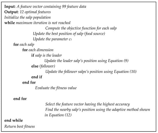 Since we noticed, from a literature review, that the main disadvantage of SSA is their local optima issue. Then, we propose the adaptive technique to solve this weakness of SSA by improving its development ability between exploitation and exploration. The idea of this proposed technique is to enlarge the searching space of the salp while finding the new salp’s position, which may possibly be located nearby. The procedure of the PQD classification using the adaptive SSA as the feature selection algorithm is described in following detail, while its pseudo code is illustrated in Figure 3.