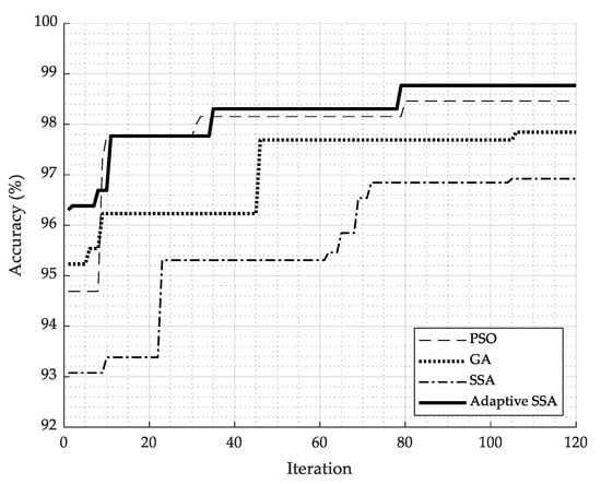 As mentioned earlier, one of the outstanding advantages of the SSA is its very fast convergence property. It is, therefore, necessary to examine the convergence profile of the proposed algorithm. In this work, we compared the convergence rate of our proposed system to the convergence rates of other well-known algorithms, such as PSO and GA. Figure 4 shows a comparison of the convergence rate of the PQD classification system using different algorithms for optimal feature selection, while the detail of accuracy and required iterations is summarized in Table 8. It was found that the system based on the adaptive SSA had the highest convergence rate to reach the classification accuracy of 98.77% at iteration 79. The conventional SSA can provide 96.85% accuracy at iteration 105. Meanwhile, the accuracy of 98.46% was reached by the PSO at iteration 80 and of 98.15% was reached by the GA at iteration 106. Then, the classification system using the adaptive SSA is not only able to provide very high accuracy, but it also has a rapid convergence rate.