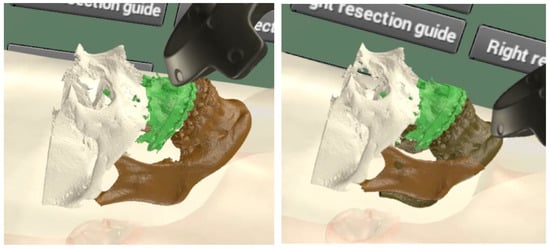 VR simulation was performed in virtual space with segmented and registered 3D models, by controlling with a controller (Vive Pro, HTC Vive, Taipei, Taiwan), wearing the head mount display (HMD). The maxilla position was adjusted for posterior impaction and advancement, and then the distal segment of the mandible was moved for the optimal position, matched with the maxillary position (Figure 2).