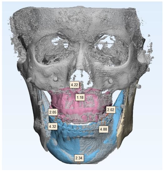 The differences between the preoperative plan and postoperative 3D model were 1.18 mm at ANS, 4.22 mm at PNS, 2.05 mm at Right MxM1, 2.02 mm at Left MxM1, 2.34 mm at Pog, 4.32 mm at Right MnM1, and 4.88 mm at Left MnM1. The mean value was 3.00 mm and the standard deviation was 1.44 mm. The maximum distance was 4.88 mm at Left MnM1 and the minimum distance was 1.18 mm at ANS (Table 1).