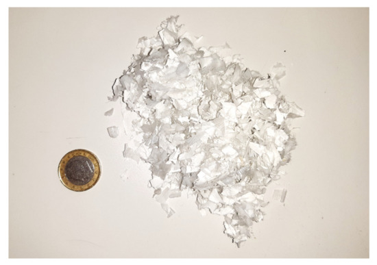 The CFs were grinded using a mechanical shredder, set up in order to have particles up to 10 mm. From a visual analysis of the obtained shredded CFs (Figure 1), the material is mostly composed of cellulose acetate fibers, with traces of plug wrap paper and tipping paper.