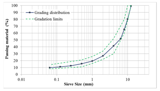 In the present research, the adopted mix design for the SMA followed the District of Bologna technical specification [32]. The grading distribution is presented in Figure 2 and Table 2, while the rheological properties of the used bitumen are reported in Table 3.