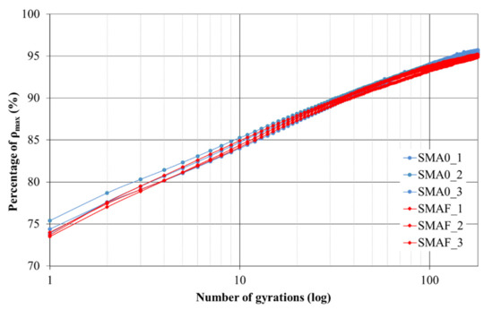 The volumetric properties of the two different SMAs were assessed with the air voids (AV) content analysis (EN 12697-8 [41]) on three samples for each mixture according to three different compaction levels (10, 100 and 180 gyrations). The evaluation of the workability and compactability properties of the mixtures was corroborated also by the analysis of the gyratory compaction curves.