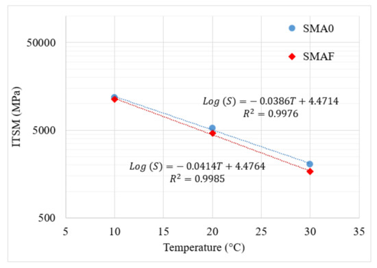 The evaluation of the stiffness modulus was carried out according to the [43] with an indirect tensile test configuration. Three SGC samples (100 gyrations [40]) for each mixture were tested at 10, 20 and 30 °C in order to investigate the thermal sensitivity of the bituminous mixtures. The relation between the stiffness modulus and temperature can be described by the following equation:
