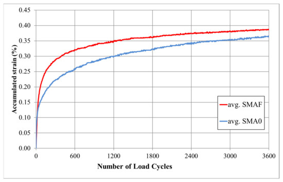 The durability of the bituminous mixtures was also evaluated in terms of rutting resistance. In fact, this represents a common pavement disease for high bitumen content mixtures for surface layers. According to the [45] standard, method A, a bituminous sample is placed between two parallel plates. The upper plate applies a cyclic compression load and has a dimension smaller than the bituminous sample in order to achieve a certain confinement. The standard specifies a load frequency of 0.5 Hz and a pressure of 100 ± 2 kPa. The specimen’s accumulated axial deformation is measured after 3600 loading cycles at 40 °C. Three SGS samples (100 gyrations, [40]) were tested for each mixture and the average results are presented in Table 10 and Figure 5.
