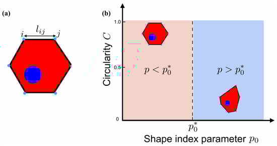(a) In the vertex model, an osteoblastic cell is represented as a polygon with six sides and is specified by the surrounding vertices, where the length of the side between two neighboring vertices and is . The cell shape is determined by quasi-static simulations in which a force-balanced state is achieved using an algorithm that performs a Monte Carlo-based minimization of Equation (3). In the final force-balanced state, the shape of the cell is defined by its area and perimeter . (b) Earlier studies of the vertex model have shown that when the shape index factor is below a critical value , the stable configuration is the ground state and has the shape of a regular polygon, i.e., with higher circularity value. However, when the value of is higher than , the ground state is degenerated and the polygon has an irregular shape, which is characterized by a lower circularity value.