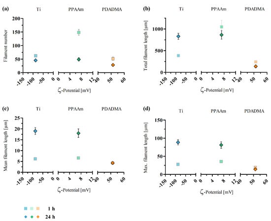 FilaQuant-based quantification of actin filaments in MG-63s after 1 and 24 h on negatively charged Ti (blue), moderately positively charged PPAAm (green), and highly positively charged PDADMA (orange). (a) Number of actin filaments. (b) Total filament length. (c) Mean filament length. (d) Maximum filament length. Note the significantly higher number of filaments on moderately positively charged PPAAm after 1 h and the resulting increased total filament length. Whereas the highly positively charged surface PDADMA leads to a drastically diminished filament number and length after 24 h, there are no significant differences in filament length and number between Ti and PPAAm. (Statistics are shown in Table 2, n = 10 cells per surface).